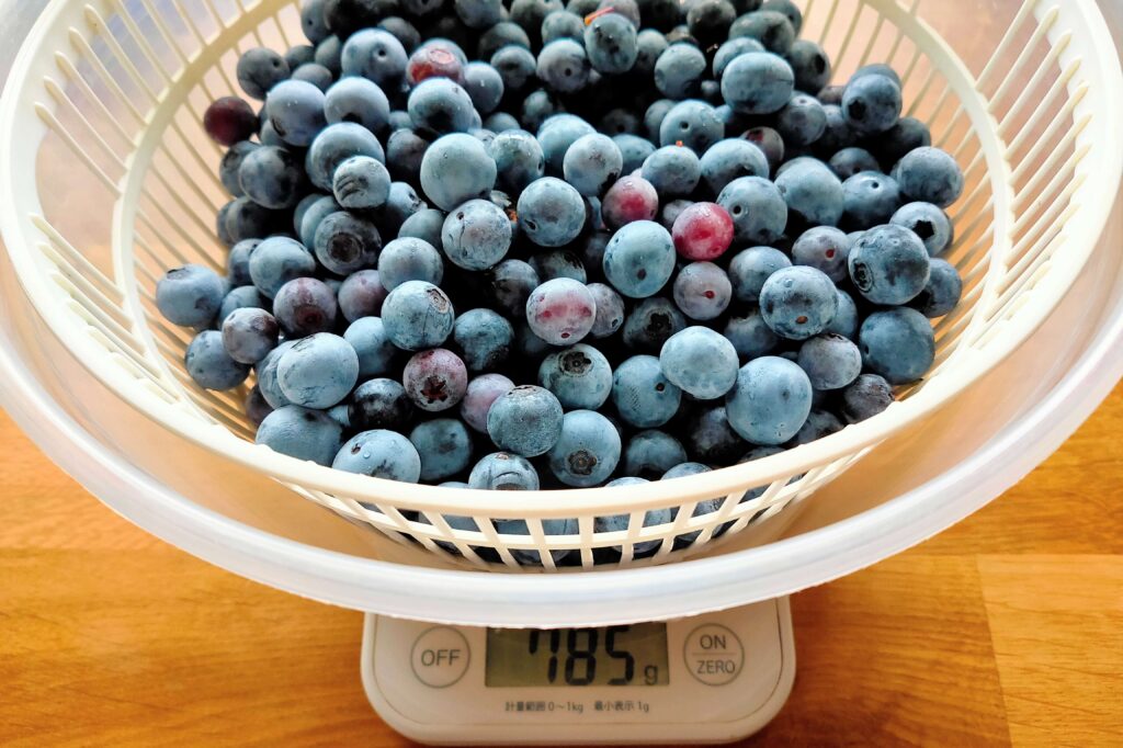 水を浸して洗ったブルーベリーの水気を切って軽量します。