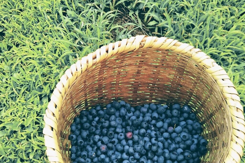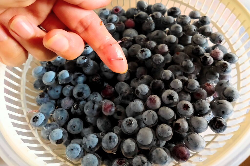 ブルーベリーをザルに入れて1時間ほど水に浸し、ホコリを落とします。