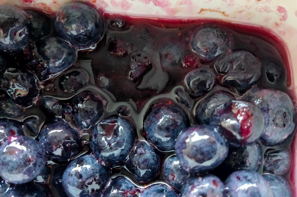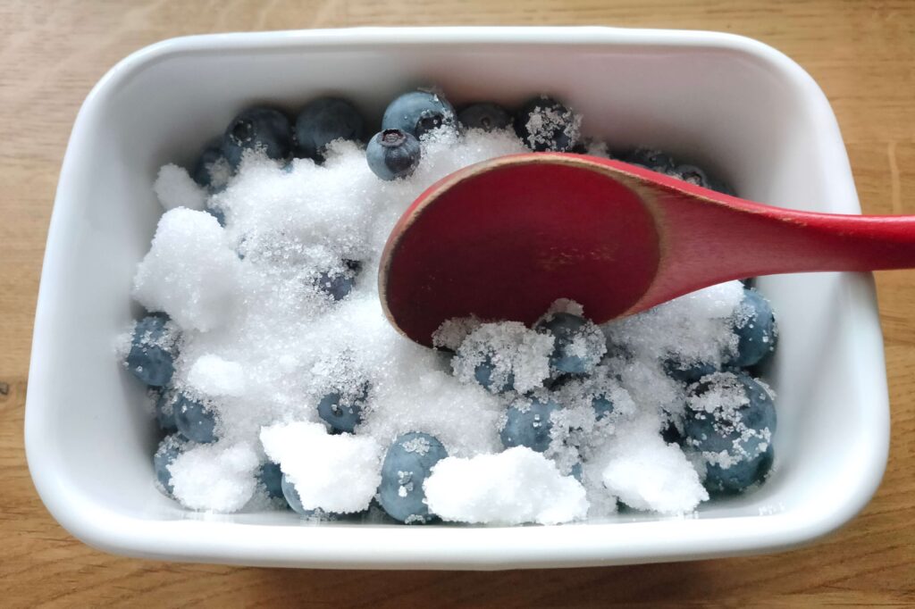 ブルーベリーとグラニュー糖を琺瑯容器に入れてよくまぶし、ジュース(果汁)が出てくるまで常温で1時間以上置いておきます。